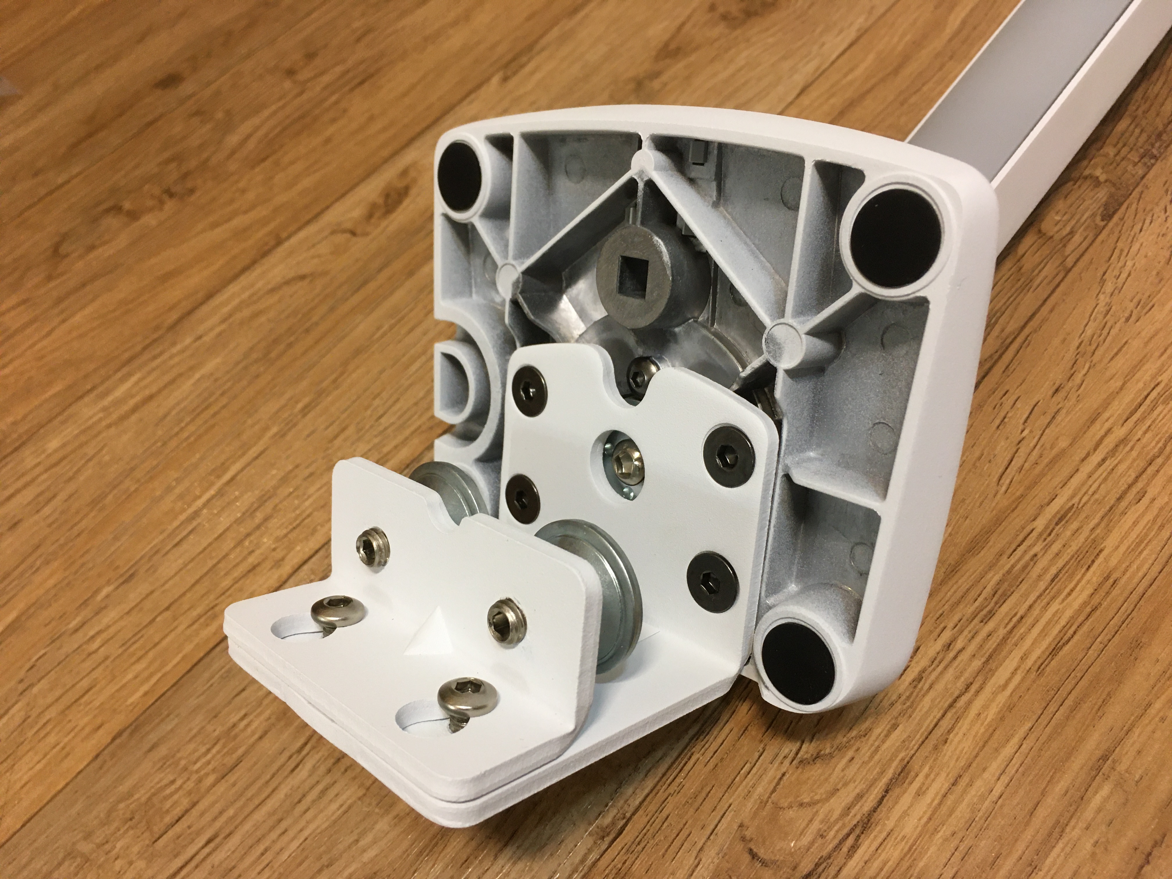 테이블 윗면과 닿는 부분은 고무패드가 붙어있다. 밑에 나사를 육각렌치로 돌려서 조이는 형태이다. 밑에는 고무패드가 없다.
